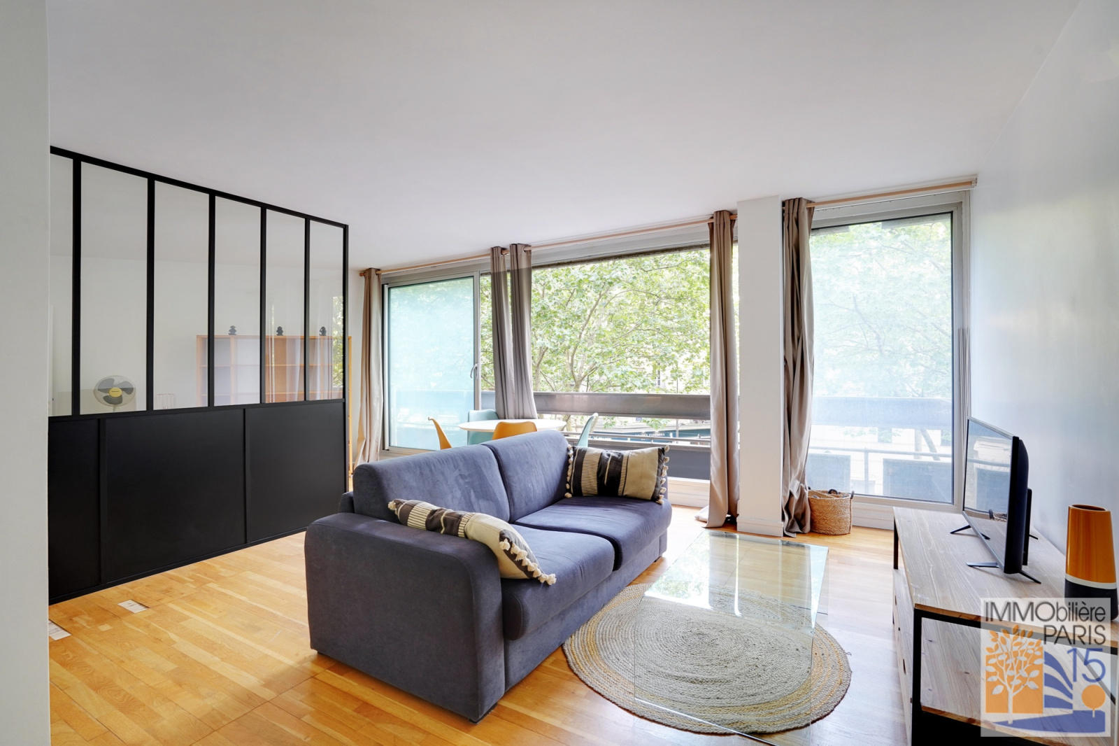 Lumineux et parfaitement agencé, il offre une belle pièce de vie de 33,53 m², entièrement baignée de lumière grâce à de larges baies vitrées donnant sur les arbres. Actuellement une verrière vient délimiter un coin nuit confortable tout en conservant la clarté de l’ensemble.