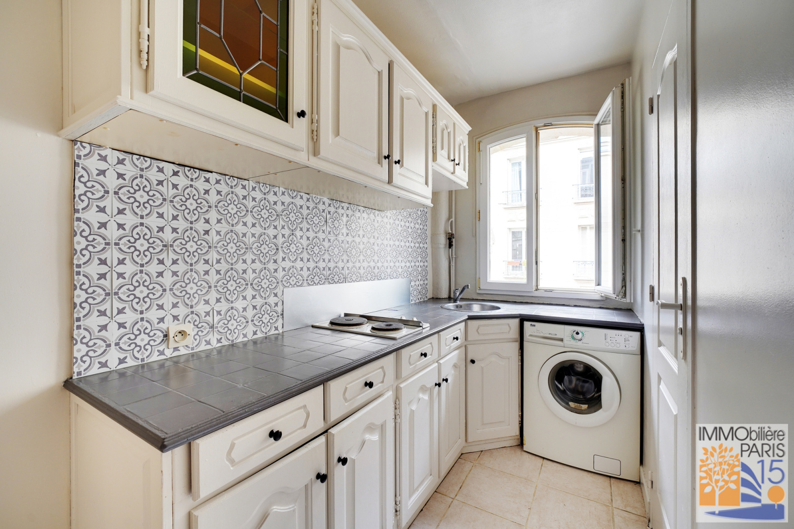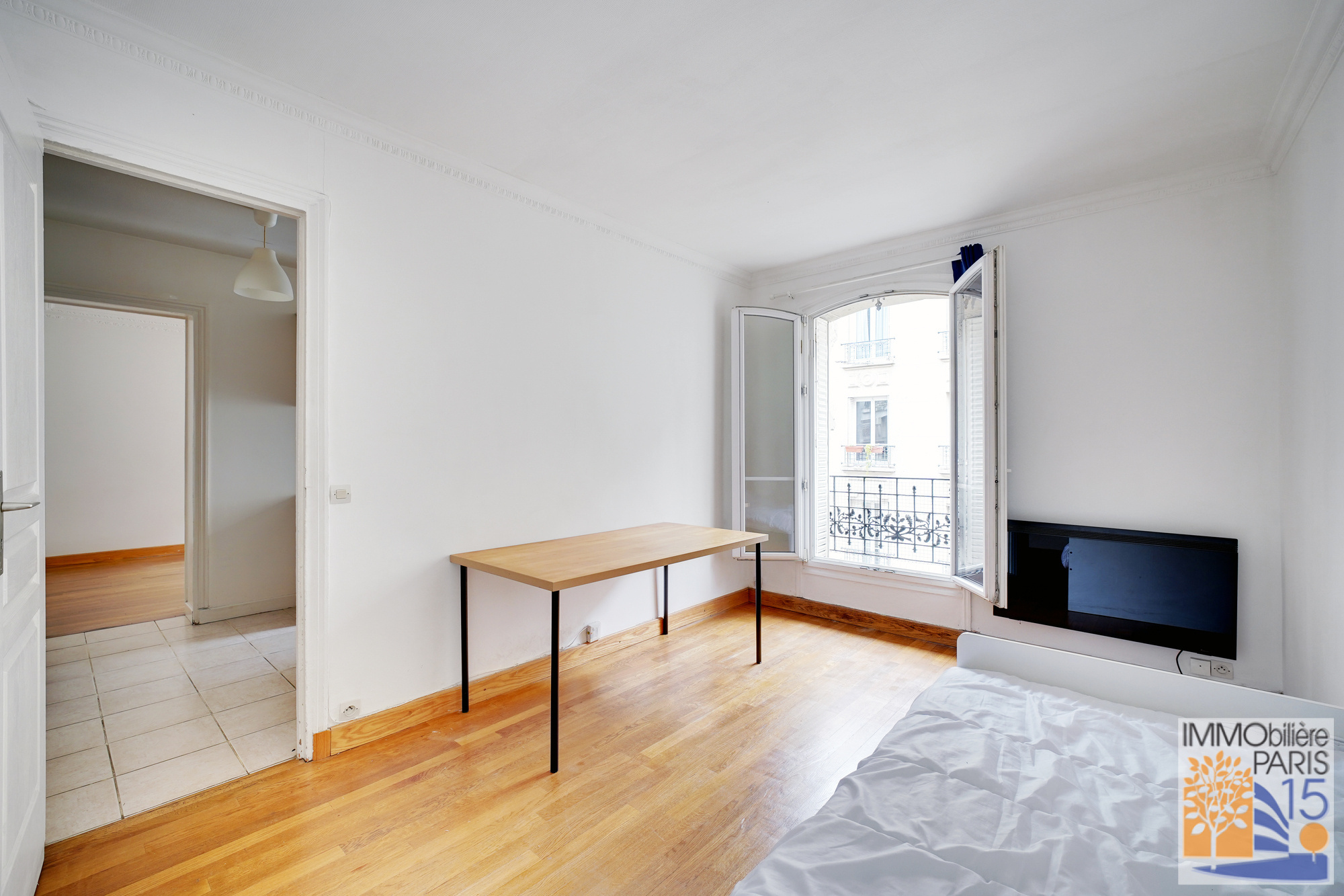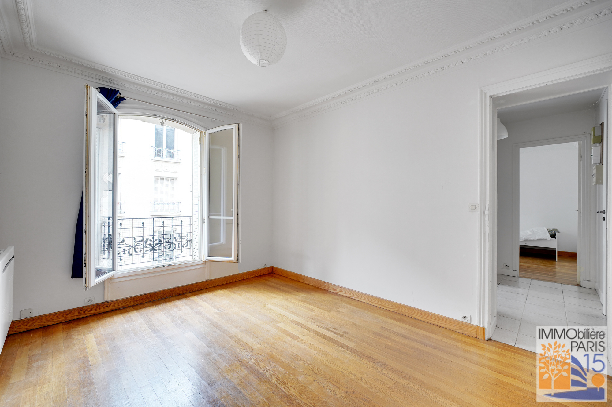 L'agence Immobilière Paris 15 vous propose, au quatrième étage d'un bel immeuble pierre de taille, ce joli deux pièces de 34.60 m², en bon état, avec le charme de l'ancien, parquet, moulures, comprenant une entrée avec cuisine ouverte, une salle d'eau avec WC avec fenêtre, une chambre avec dressing et un séjour sur rue. Immeuble très bien entretenu, à proximité des commerces et des transports, quartier animé et dynamique, cave en sous-sol, étage élevé sans ascenseur, local vélos au rez-de-chaussée