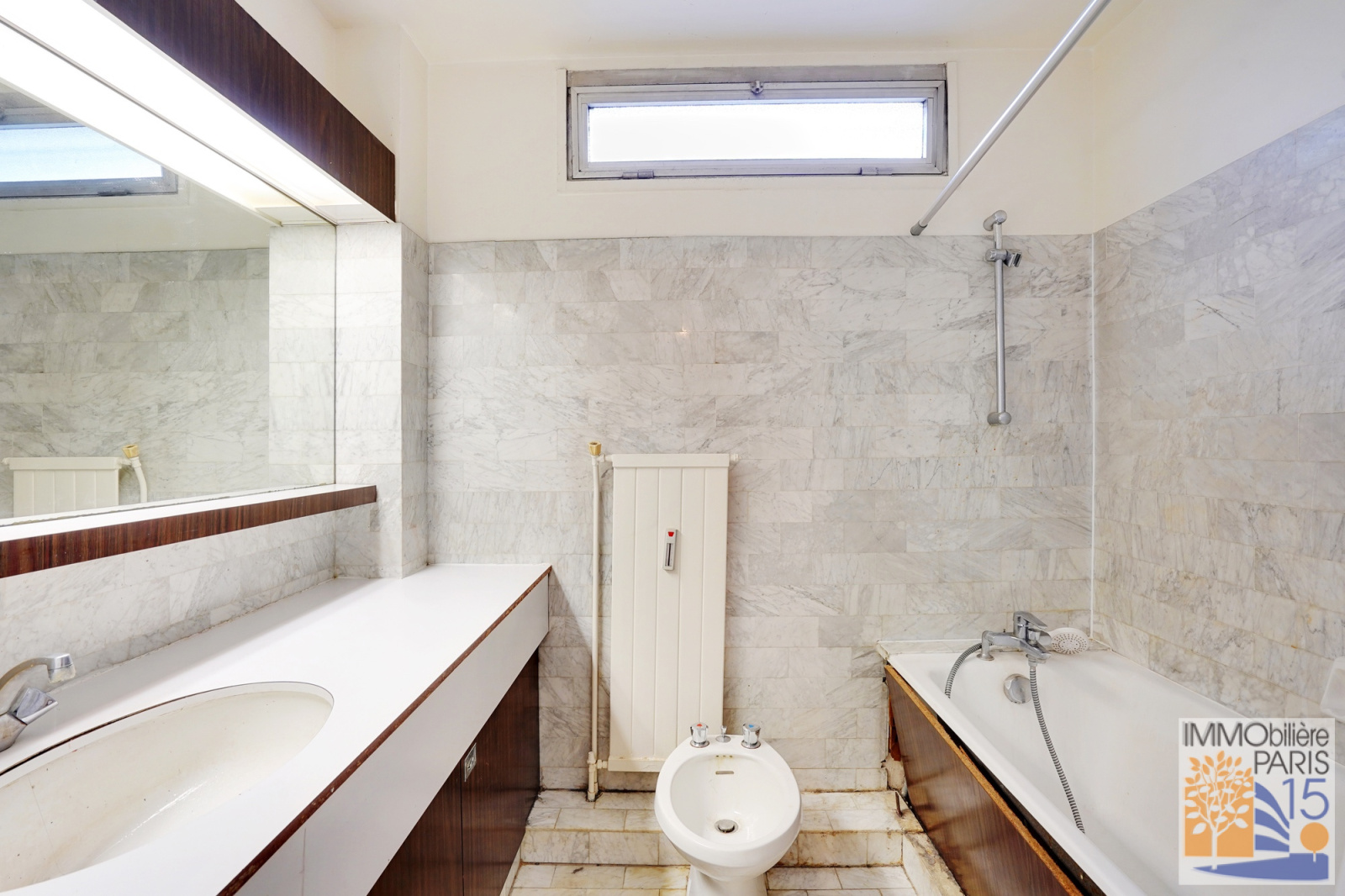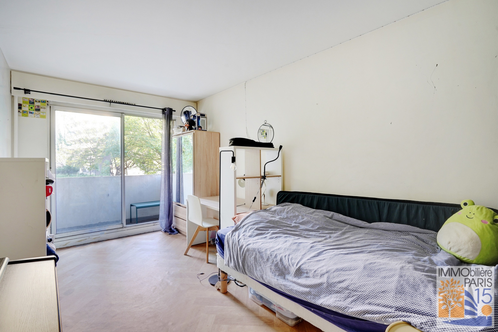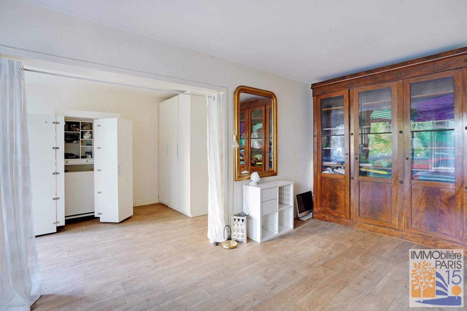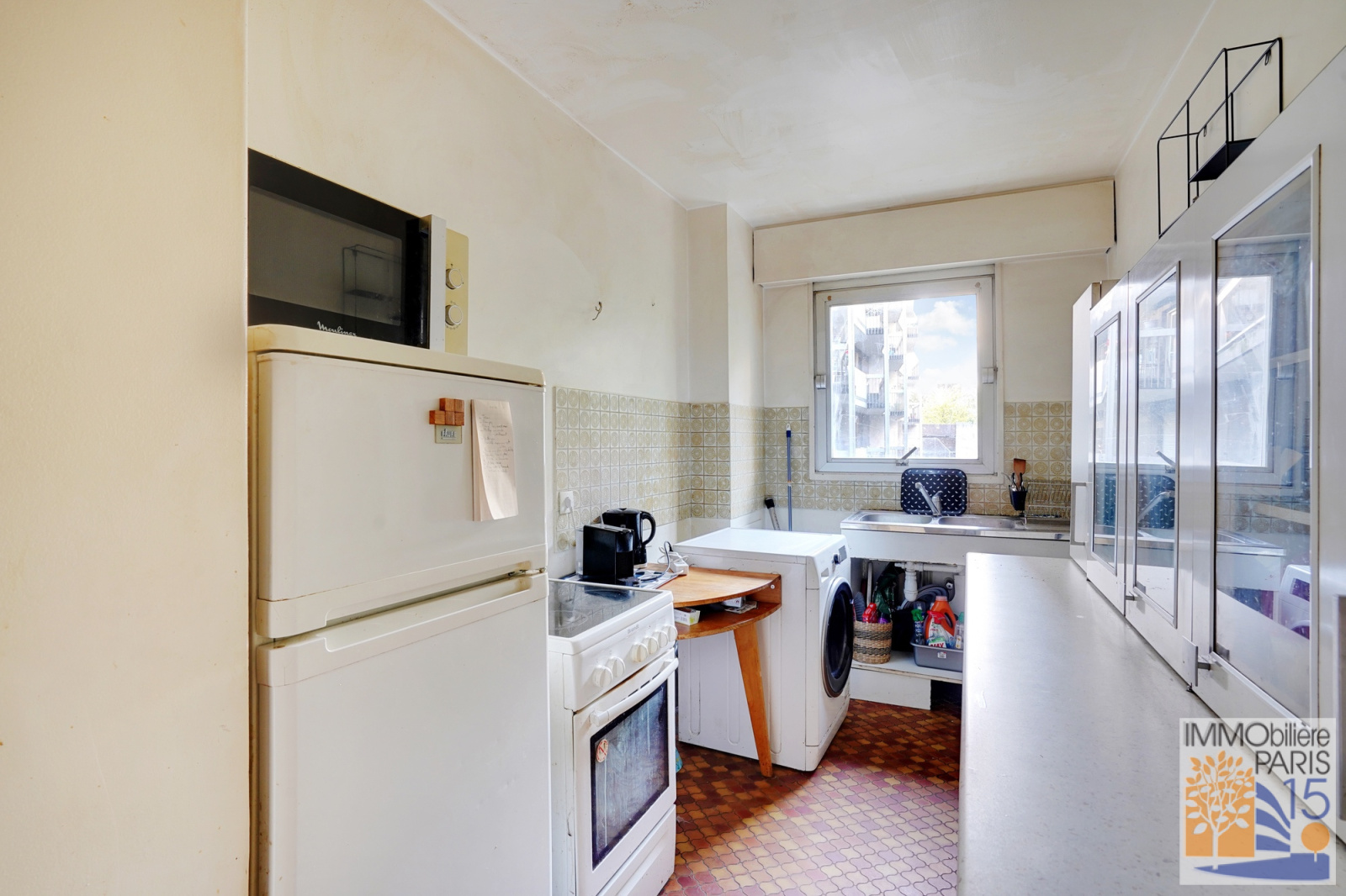 L'agence Immobilière Paris 15 vous propose proche du métro Bir Hakeim, dans une rue au calme, dans une résidence de standing avec gardien, un 3 pièces donnant entièrement sur balcon/terrasse dans la verdure composé d'une entrée, d'un salon / séjour (ou 2ème chambre), d'une chambre, d'un dégagement avec rangements, d'une salle de bains avec fenêtre, d'une cuisine séparée équipée et d'un WC indépendant. Chauffage et eau chaude collectifs, cave en sous-sol. Appartement à rénover complètement. 1er étage avec ascenseur. Ravalement en cours. Nombreuses possibilités d'aménagement (par exemple séjour avec cuisine américaine possible de 35m² + 2 chambres). Possibilité d'acheter un emplacement de parking en sous-sol en sus pour 25600€.