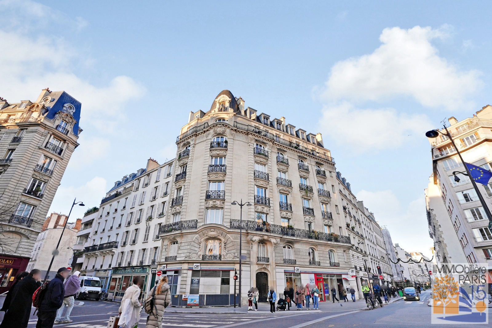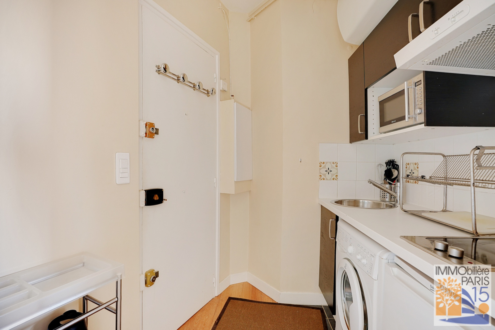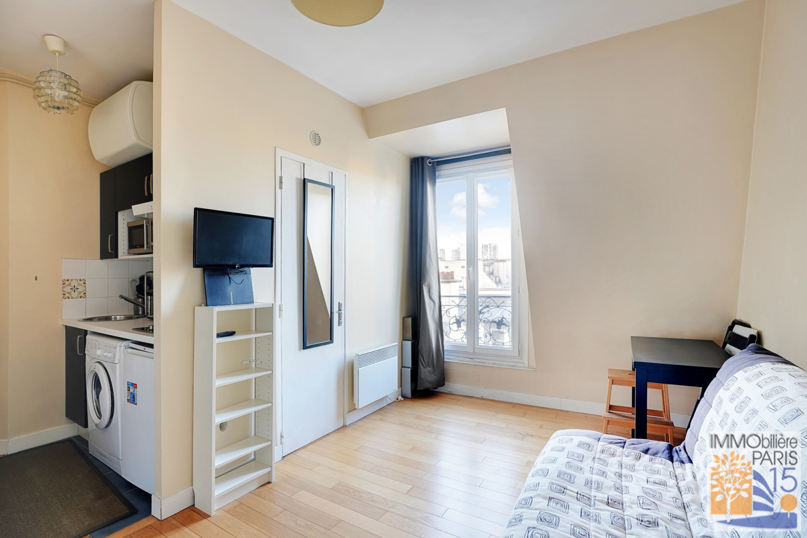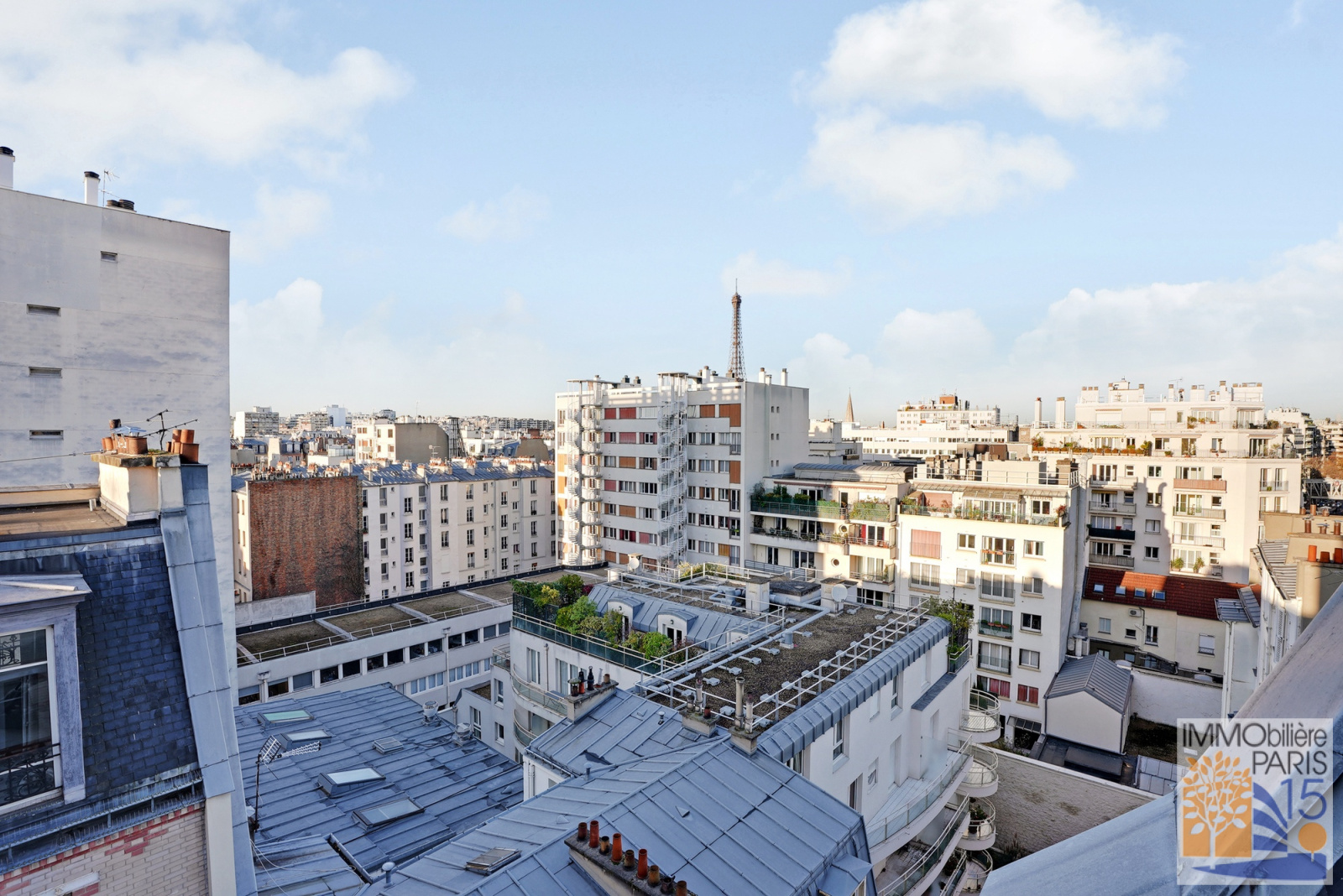 L'Agence Immobilière Paris 15 vous propose en exclusivité, rue du Commerce, dans un superbe immeuble en pierre de taille, un studio de 17,21 m² au sol (15,61 m² loi Carrez) en bon état, situé au 7ᵉ et dernier étage avec ascenseur, offrant une vue dégagée sur la Tour Eiffel.